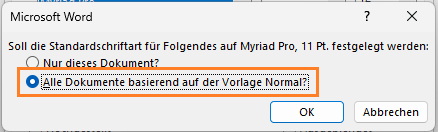 Wichtig ist die Auswahl Alle Dokumente basierend auf Normal.dotm. Die Datei Normal.dotm ist die Standard-Vorlage von Word. Wenn Sie dort Ihre Einstellungen speichern, erscheinen sie in jedem neuen Dokument. Den Speicherort finden Sie meist in Ihrem AppData- oder Benutzerprofil-Ordner (je nach Betriebssystem und Word-Version unterschiedlich).
