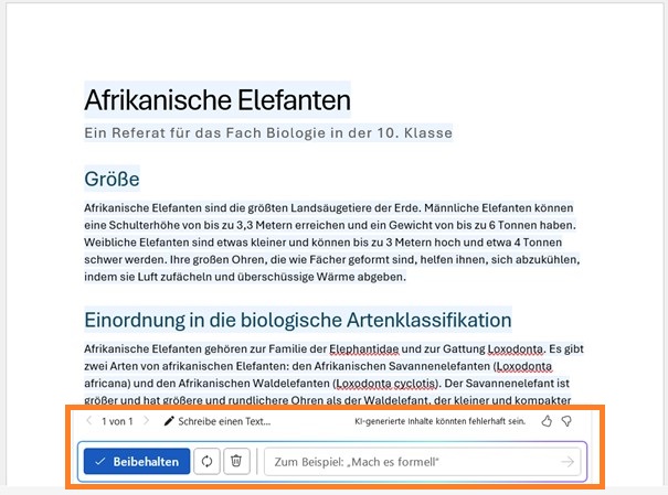 Das Ergebnis erscheint formatiert mit den Standard‑Formatvorlagen von Word. Prüfen Sie den Text, passen Sie Ton und Länge an und fügen Sie Quellen oder spezifische Details hinzu. Copilot berücksichtigt nicht immer automatisch Ihren gewünschten Umfang; fordern Sie bei Bedarf eine Erweiterung oder Kürzung an.