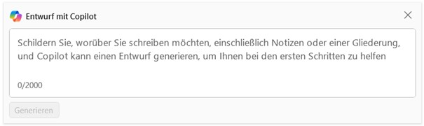 Nach Klick auf „Generieren“ erstellt Copilot einen Textvorschlag. Je nach Komplexität kann das einige Sekunden bis wenige Minuten dauern. Sie können die Erstellung jederzeit abbrechen, wenn die Wartezeit zu lang ist.