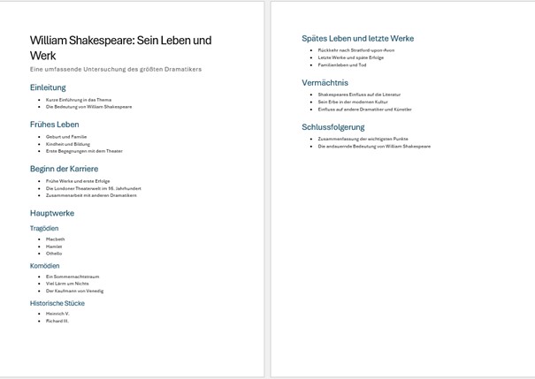 Beispielprompt 2: Erstelle eine Struktur für ein Buch über Leben und Lebenswerk von William Shakespeare.